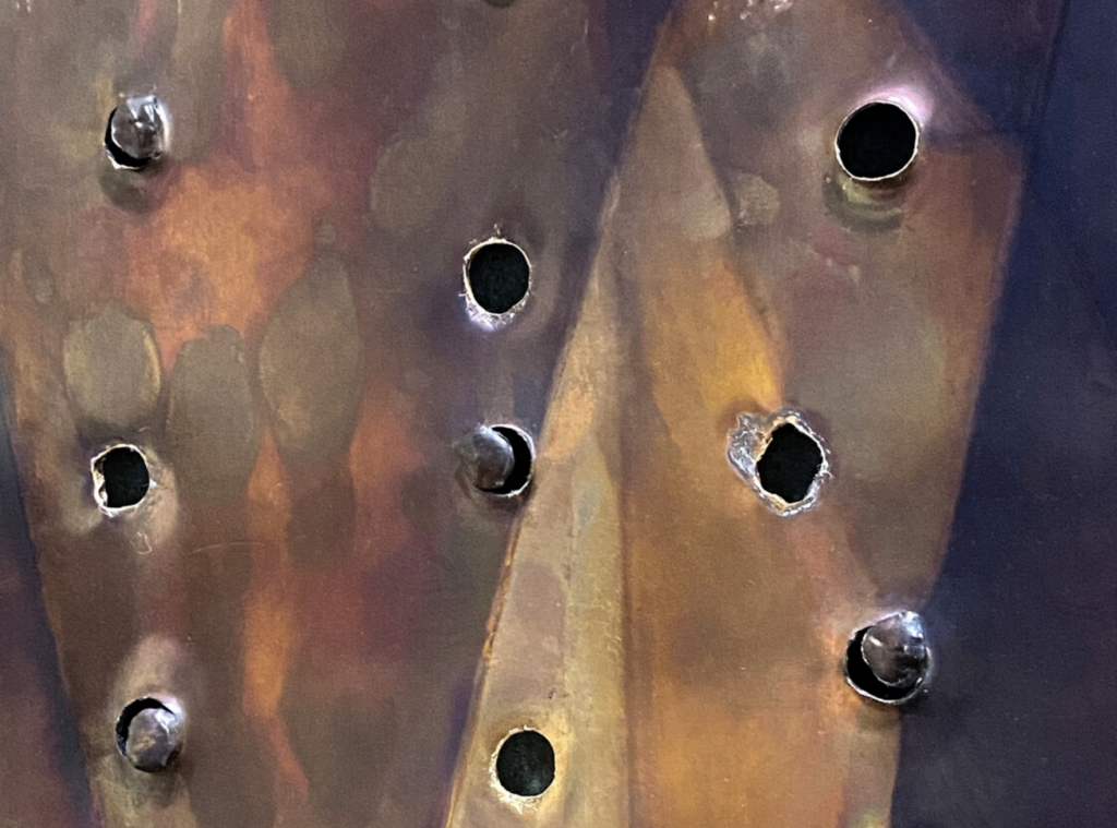 Malcolm’s abstract copper art works are in a style that he calls “Membrane Art”. A working practice that is characterised by mark makings on curved structures rather than on a flat picture plane. The surface geometry underpins the aesthetic of each piece. So the drilling, saw cuts, patina (staining) processes were all developed through the practice of allowing the curved surface geometry to play a part in creating distinctive expressions before the transformation of flattening the profile. An aesthetic thought that he has been evolving since 2004.